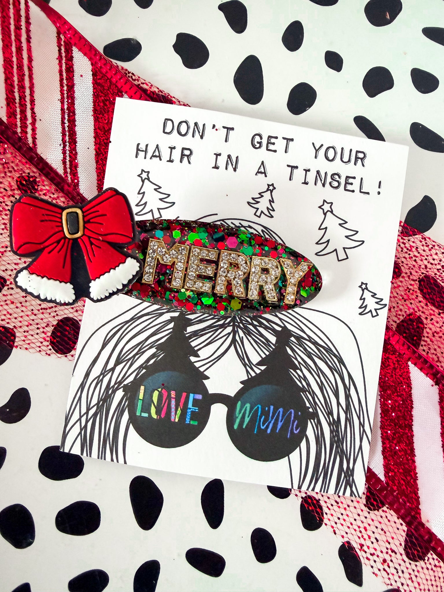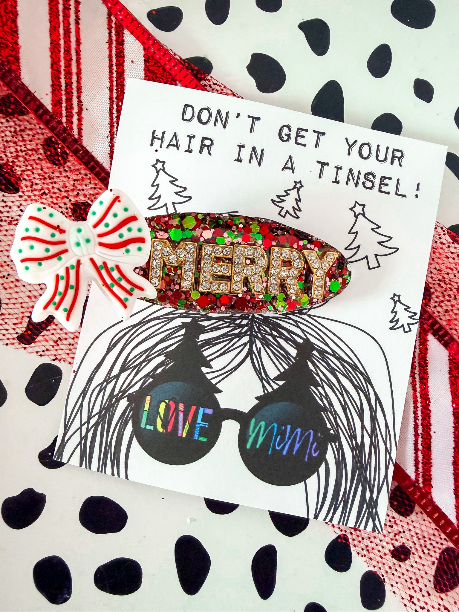 Get your MERRY on with this sparkly + sweet hair clip!! Two design choices for the bow charm and extra glittery rhinestone letters make this clip the perfect accessory for any holiday outfit!