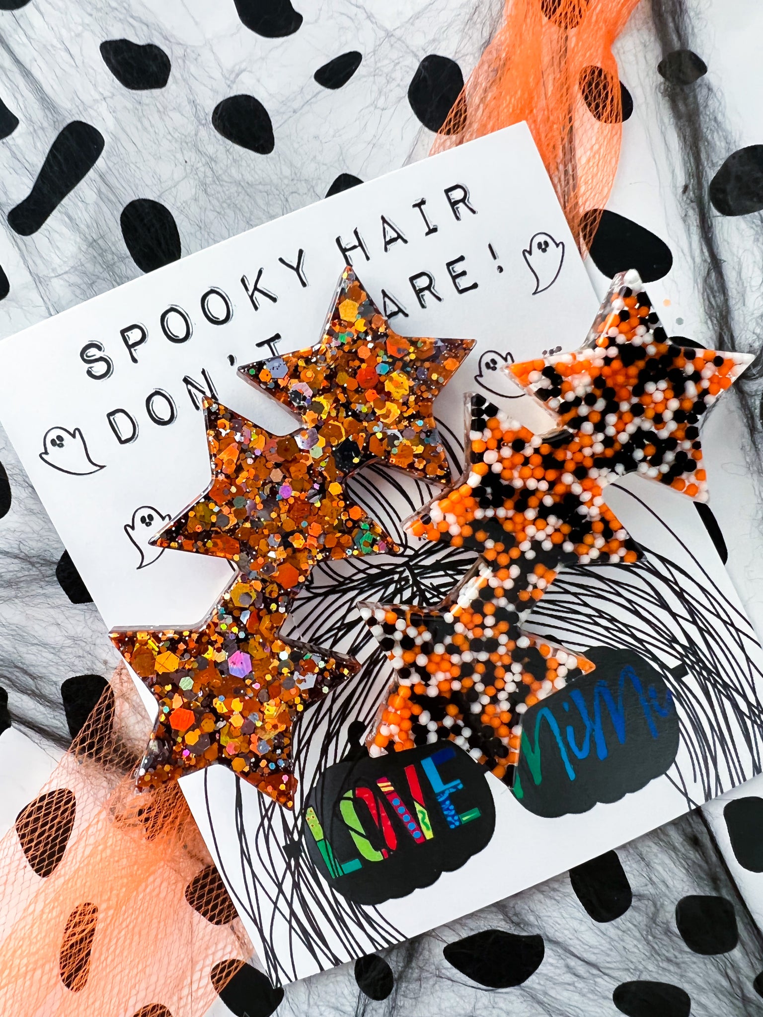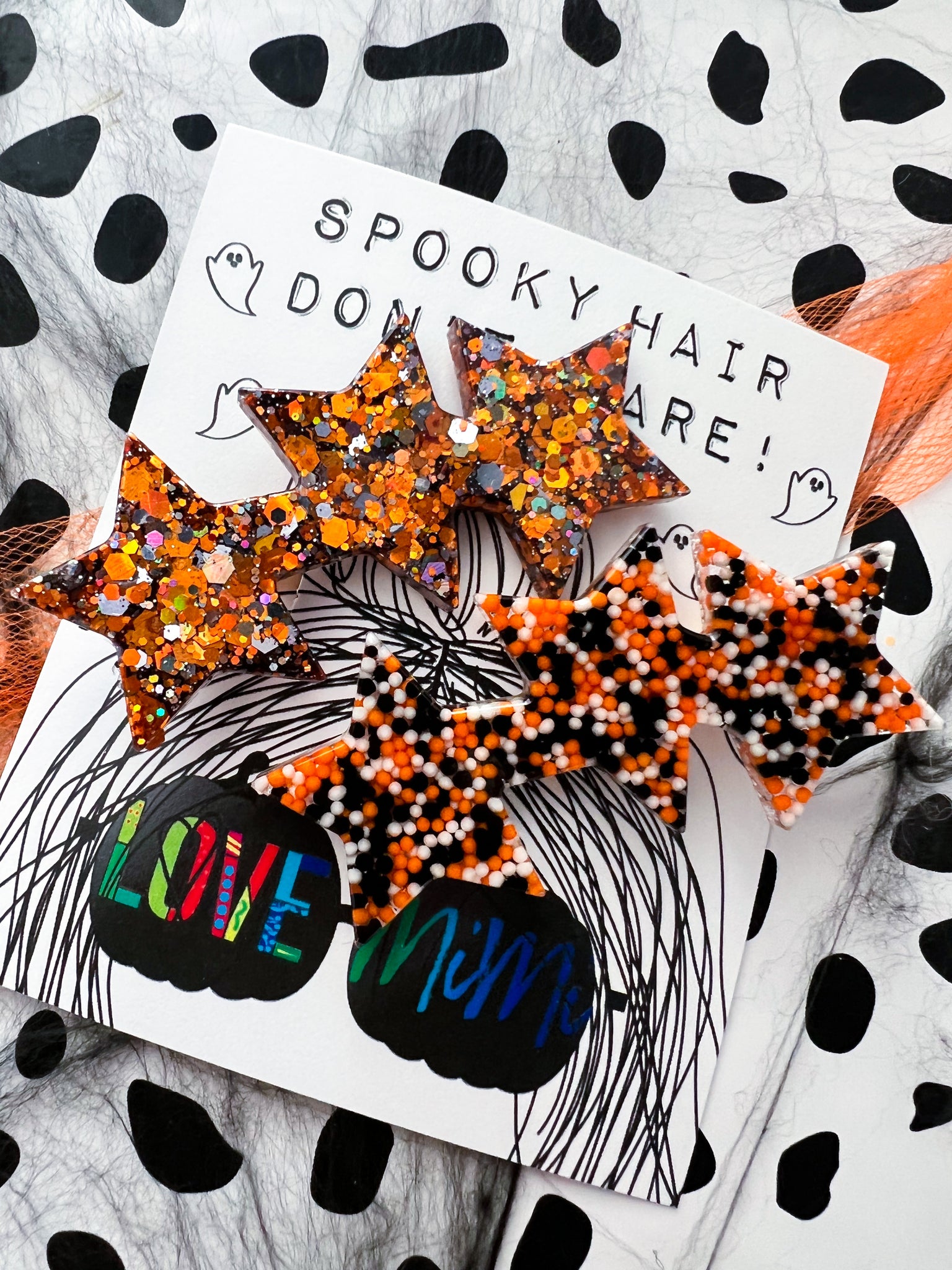 This sparkly stars set is the perfect accessory for any pigtail style! One star is filled with a Halloween sprinkle mix and the other with a chunky black & orange glitter mix.