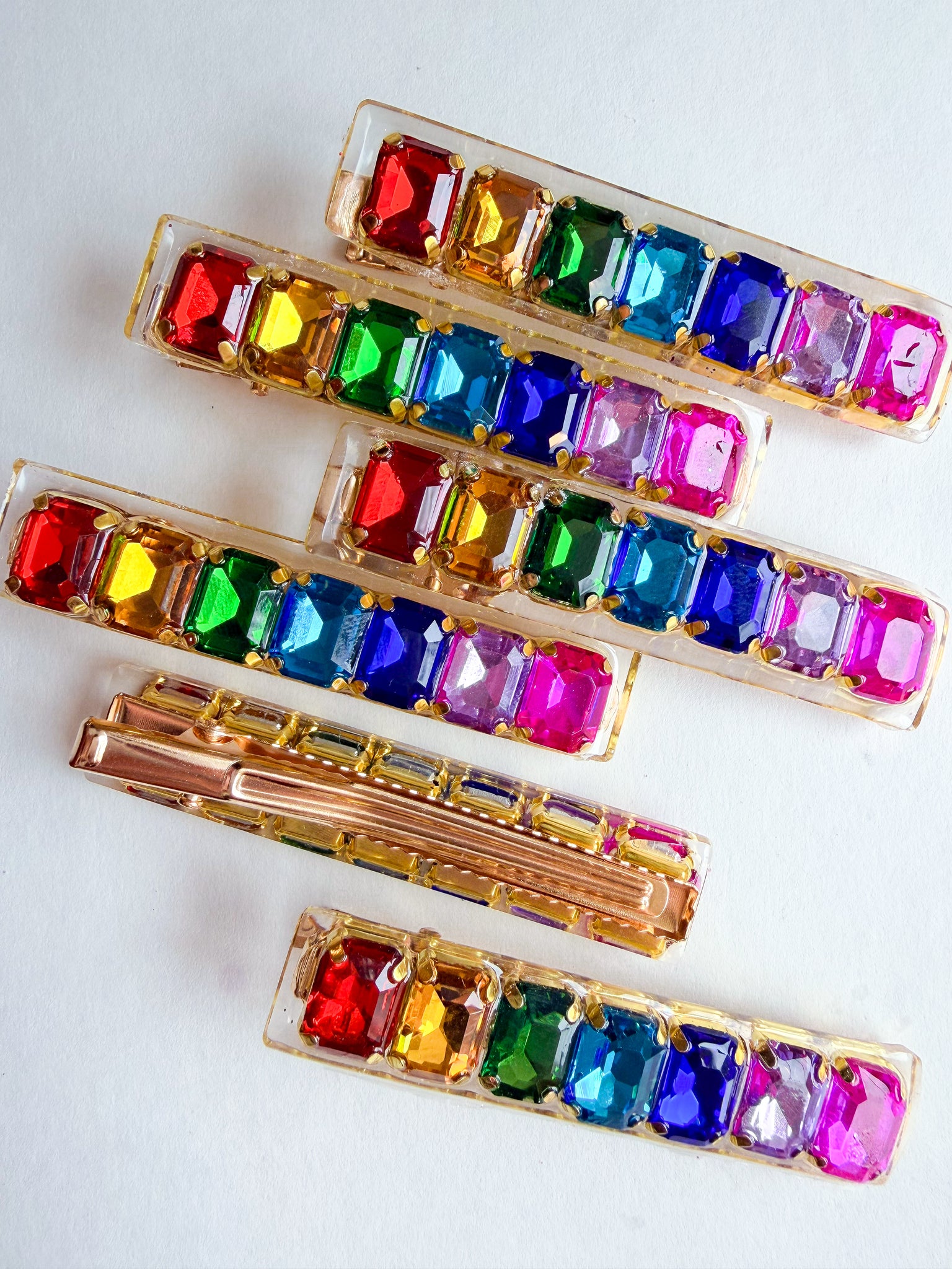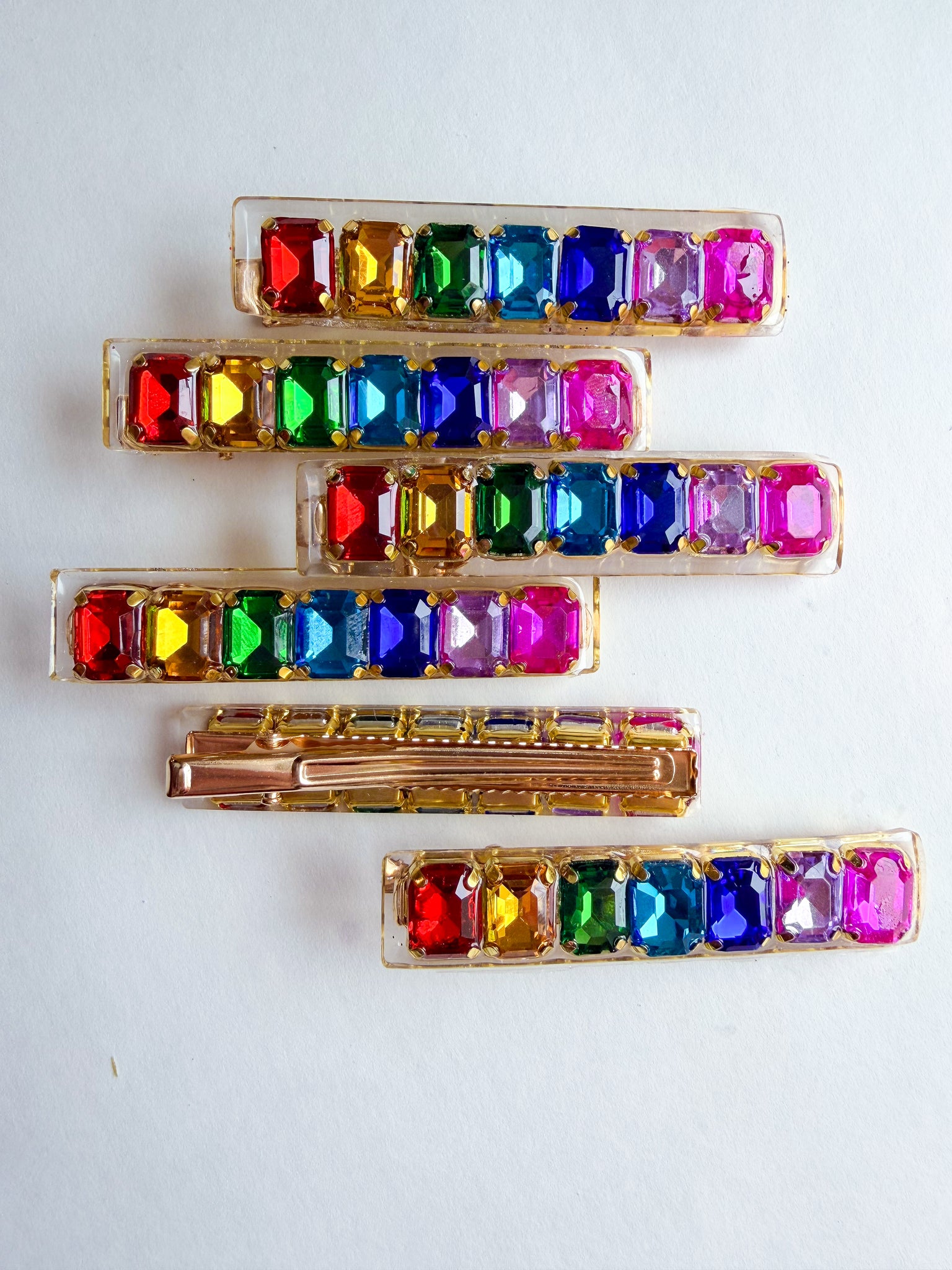 A colorful spectrum of jewels laid in clear resin and ready to add a POP to any hairstyle!! The 7 rectangular jewels are all carefully hand•placed, but may vary slightly from pictures.